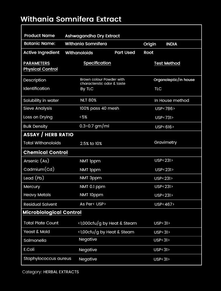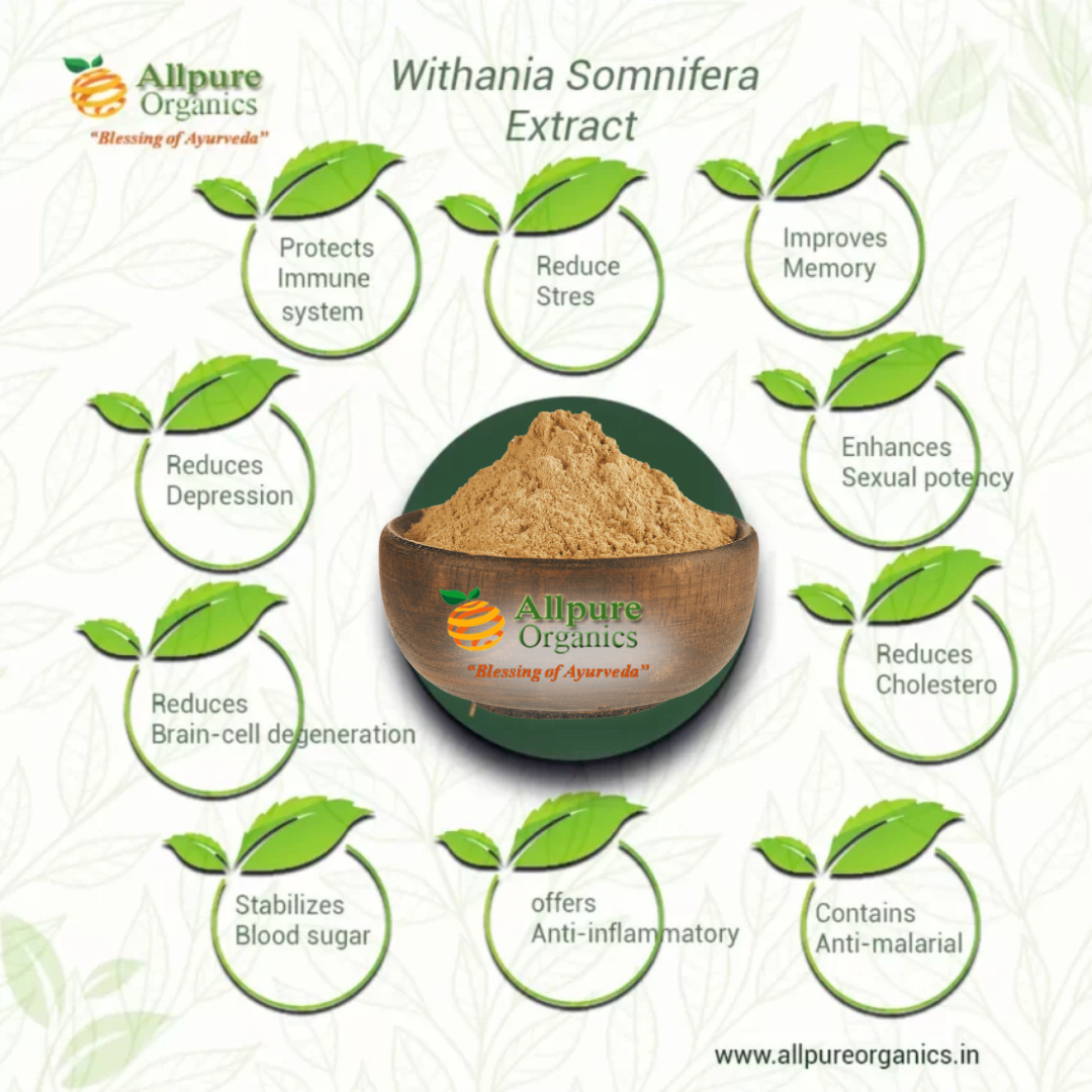 Withania Somnifera(ashwagandha or winter cherry or indian ginseng) is one of the many herbal extracts offered by us. the withania somnifera that we offer is widely found in north-western india and cultivated in the central part of india. our withania somnifera has an erect hoary tomentose unarmed shrub with petiolate, simple, stellatey, pubescent, oblong-ovate leaves. flowers of our withania somnifera are sessile, greenish-yellow in umbellate cymes with two-chambered berry fruit. withania somnifera, supplied by us, has a root 20-30cm. long with few lateral roots. the outer surface of the root is buff to grey-yellowish inner white-off white. withania somnifera, commonly known as ashwagandha (winter cherry), is an important medicinal plant that has been used in ayurvedic and indigenous medicine for more than 3,000 years. some herbalists refer to ashwagandha as indian ginseng. the plant extract has many bioactive compounds and thereby exerts antioxidant, anti-inflammatory, and immunomodulatory activities. the plant extract and its bioactive compounds are used in the prevention and treatment of many diseases, such as arthritis, impotence, amnesia, anxiety, cancer, neurodegenerative and cardiovascular diseases, and others.